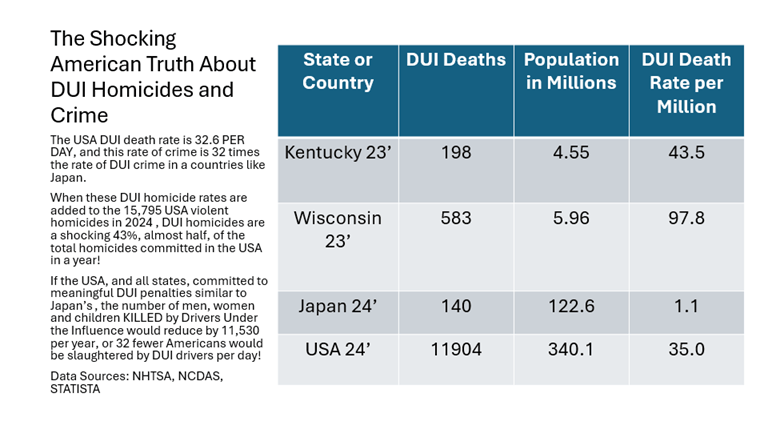 That’s right. Our DUI crime rate is 33 times that of Japan’s, and certain states like Kentucky and Wisconsin have DUI crime rates that are 40- and 88-times Japan’s DUI homicide rates! I choose Kentucky and Wisconsin simply because they are states my family lives in, where my children and grandchildren experience a substantial DUI death risk daily.